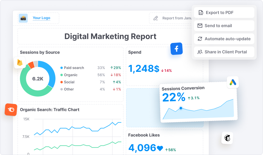 - White Labeled Reporting: Completely customize dashboards with your unique branding, including logos, color palettes, and fonts that align with your visual identity and tone. Maintain consistency in stakeholder communications.