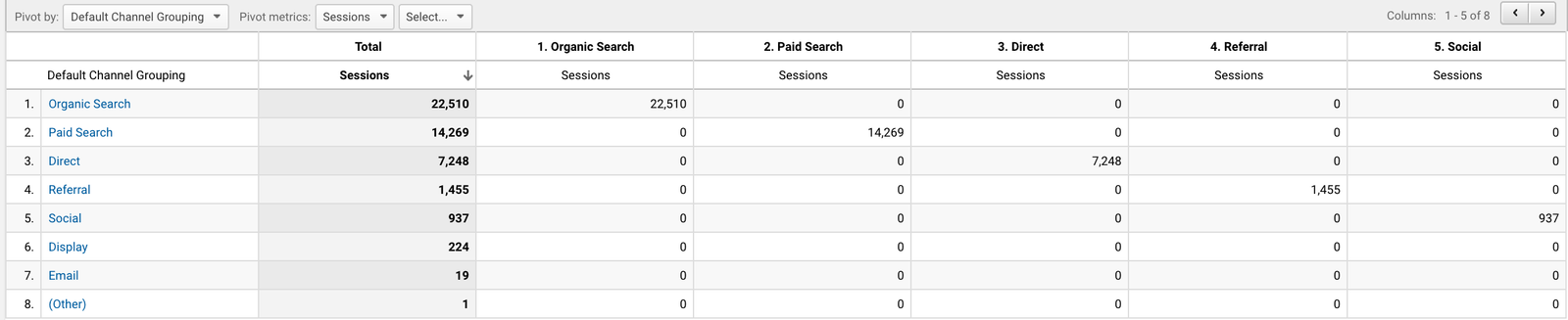 This Pivot Table is starting to get more useful than the starting pivot table, but it can become even more useful if you combine it with secondary dimensions, advanced filtering, or segments. In this example, I already removed campaigns (not set) through filters to remove useless data from the table.