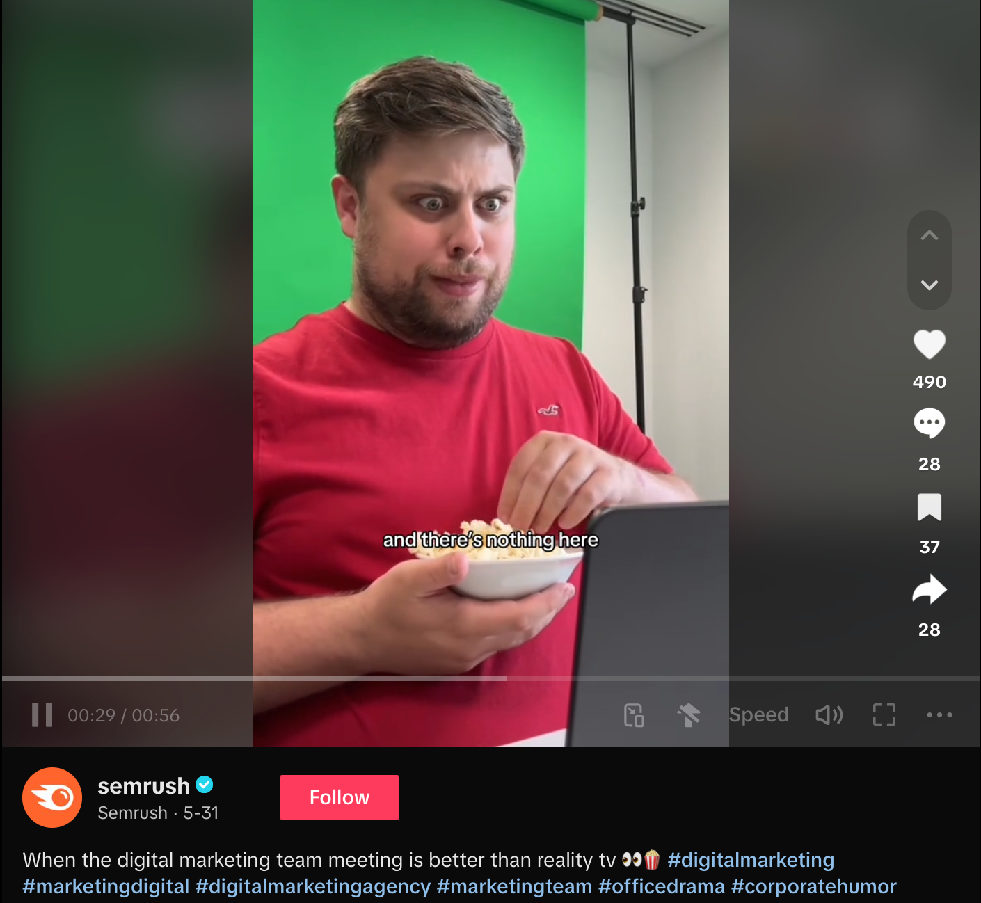 💡Pro tip: Even B2B brands can leverage humor while maintaining professionalism. Semrush's lighthearted jokes about marketers' daily struggles resonate with their target audience. Remember, TikTok's analytics can help you gauge what works best for your brand.
