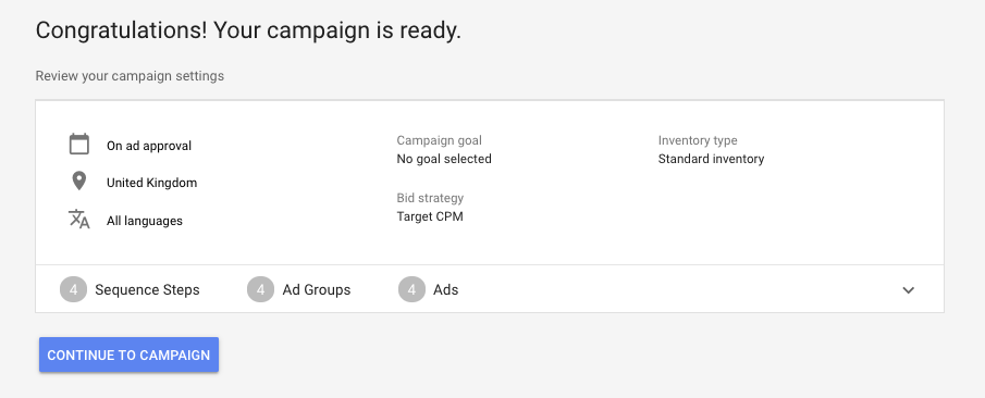 Within each step of a sequence is an ad group and a video ad in it. The majority of the settings are set up at the campaign level, i.e. bids & targeting.