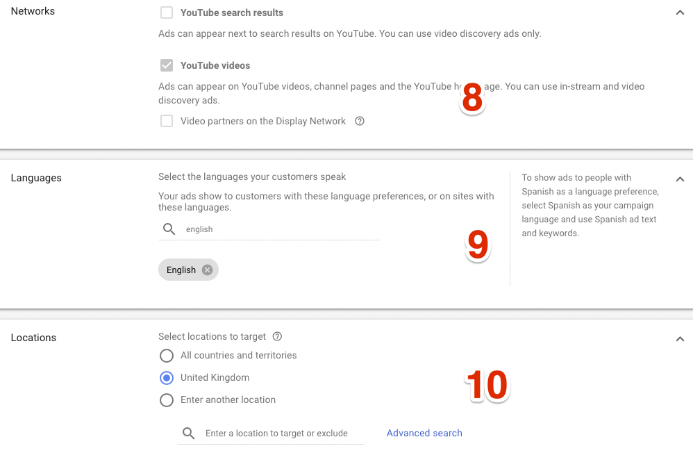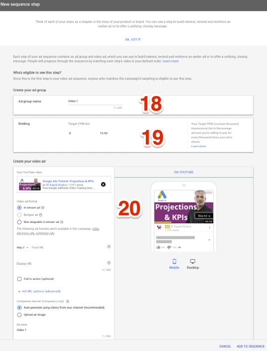 8. You can’t change anything here as the sequencing ads are only allowed to run on YouTube videos, so don’t need to worry about anything here.