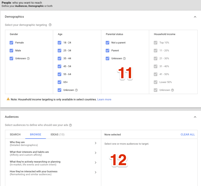 11. Demographics: Include/exclude gender, age, parental status. You can’t include/exclude household income.
