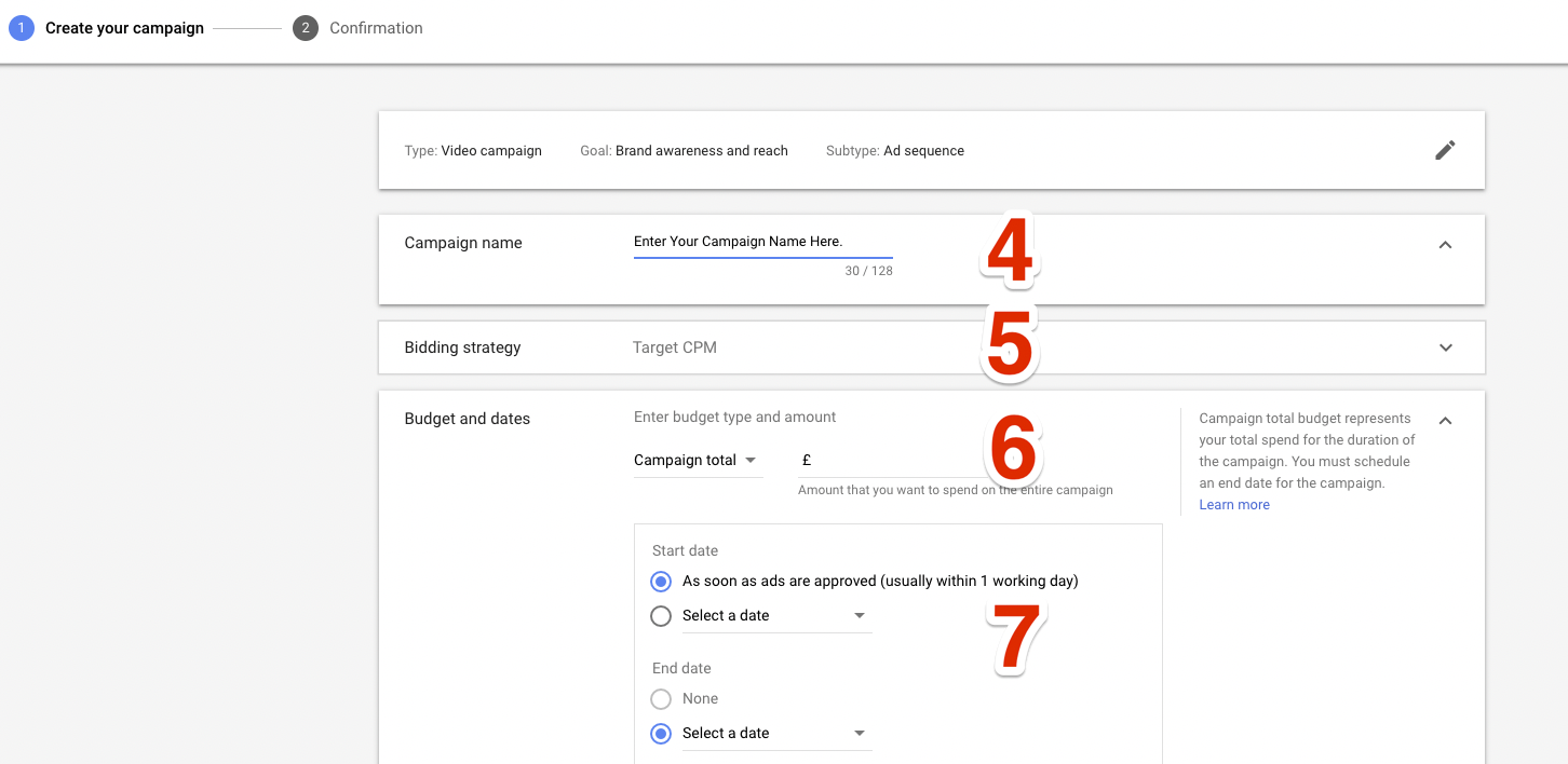 5. Choose your bidding strategy. I would start with Maximum CPV to begin with, and once you have data, you can switch to target CPM.
