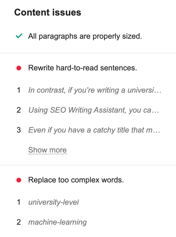 - Finally, the tool will detect if you have any content issues - e.g. long paragraphs, hard-to-read sentences or too complex words.