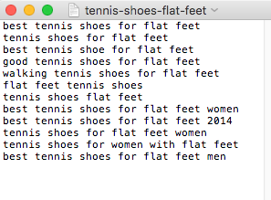 To import keywords from a .txt file, you need to place one keyword per line. See the example below of how to format a file of keywords related to “tennis shoes for flat feet”
